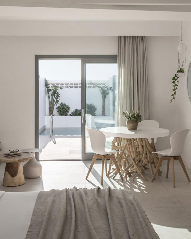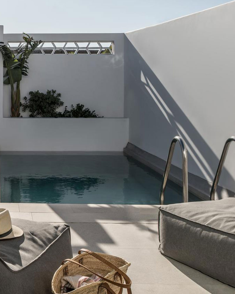 Located at the ground floor of the hotel, next to the luxuriant garden, Island is a nifty, fine and neat way to be accommodated. With Cycladic inspired pure white cement bathrooms and muted colors on every of its soft textures beddings, Island creates a unique aura of romance.